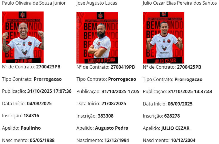 O elenco do Confiança de Sapé continua sendo formado Confiança renovações de contratos. O clube confirmou a prorrogação de contrato do lateral esquerdo Paulinho; do zagueiro Augusto Pedra e com o atacante Júlio César.