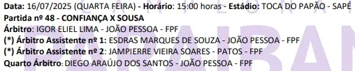 Na partida de ida, disputada no estádio Marizão, em Sousa, o Confiança de Sapé já tinha vencido por 2 a 1 e jogou o encontro de volta com mais conforto, para administrar a classificação.