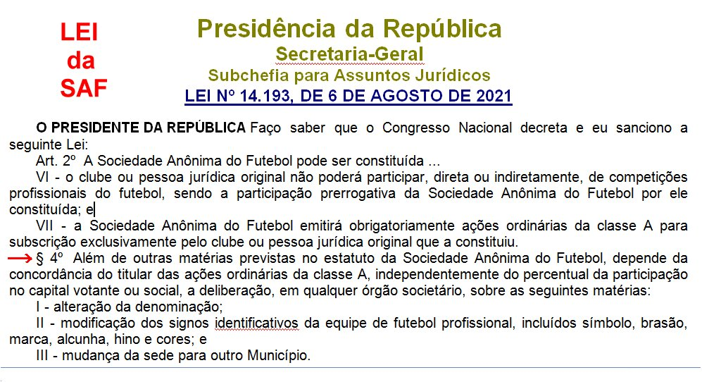 Da mesma forma, a SAF estaria INFRINGINDO o § 4º do Inciso VII do art. 2o da Lei 14.193 (SAF), se usasse um símbolo não estatutário do Clube, mesmo convocando a torcida para criar esse símbolo para a marca do Clube, mesmo que fosse alternativo.