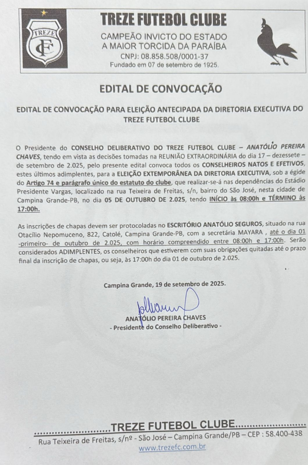 O presidente do Conselho Deliberativo do Treze, Anatólio Chaves, divulgou, neste domingo (21), o edital das eleições para escolha a diretoria executiva do clube alvinegro.