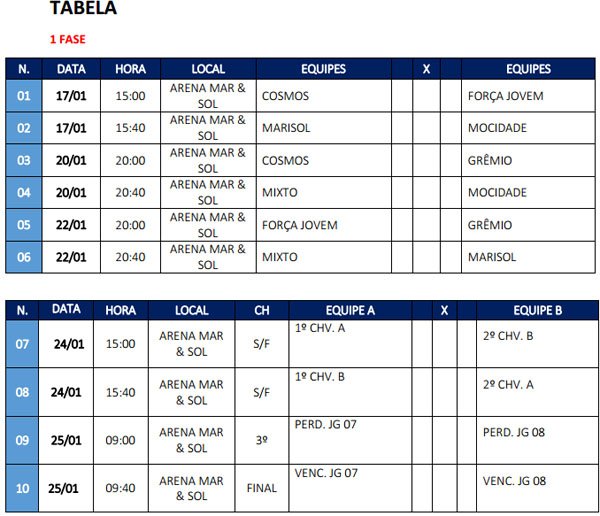 Os jogos acontecerão na arena que será montada no Cabo Branco em frente ao hotel Netuanah, a partir das 15:00h. Seis equipes brigarão pelo título que vai distribuir um total de R$ 1.200 reais em prêmio.