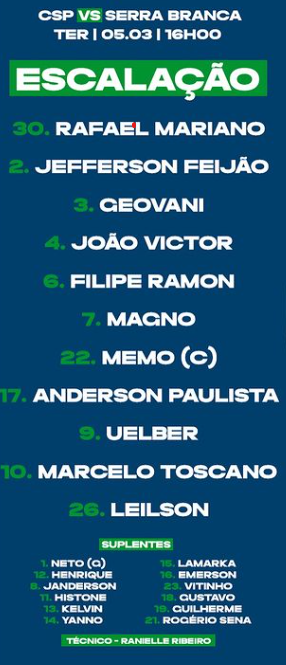 A oitava rodada do Campeonato Paraibano começa nesta terça-feira (5), com o jogo entre CSP 0x0 Serra Branca, no estádio Almeidão, às 16h, em João Pessoa. O gol foi marcado pelo volante Memo aos 18 minutos do primeiro tempo. O segundo gol do Carcará foi anotado pelo zagueiro Geovani aos 38 minutos ainda na primeira etapa. O time do Carcará está chegando aos 14 pontos ganhos.