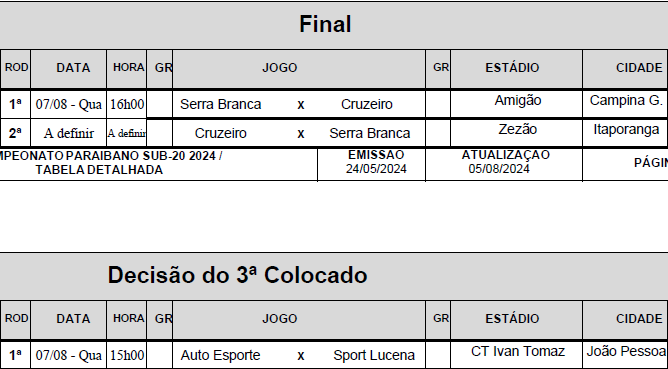 Tem ainda o jogo para escolher o terceiro colocado, entre Auto Esporte e Sport Lucena, também na quarta-feira (7). Veja a tabela completa: