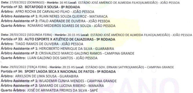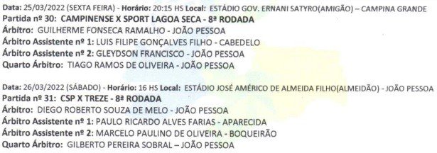 Com o jogo entre Campinense e Sport Lagoa Seca começa um a verdadeira maratona de jogos no Campeonato Paraibano de 2022. A bola rola ainda para CSP x Treze, Botafogo x Sousa e Auto Esporte x Atlético de Cajazeiras. O soesporte tem a arbitragem de todas as partidas.