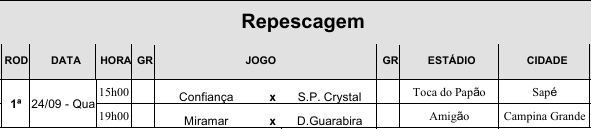 O jogo entre Confiança de Sapé e São Paulo Crystal, será também na quarta-feira (24), no estádio Toca do Papão, às 15h, em Sapé.