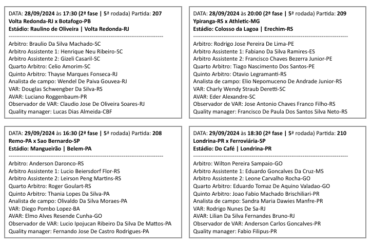 Definidas a arbitragem para os quatro jogos deste fim de semana pela Série C do Campeonato Brasileiro. Duas partidas estão programadas para o sábado (26) e outras duas serão no domingo (29). O Botafogo-PB tem como adversário o Volta Redonda-RJ, no Rio de Janeiro, de acordo com a tabela da competição nacional.