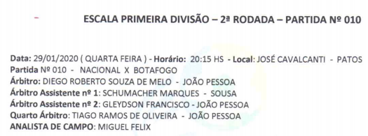 Definido o árbitro para o jogo entre Nacional de Patos e Botafogo da Paraíba, que acontece nesta quarta-feira pela segunda rodada do Campeonato Paraibano de 2020. Diego Roberto que comandou Treze 2×1 CSP, vai apitar a partida no estádio José Cavalcanti, às 20h15, em Pastos.