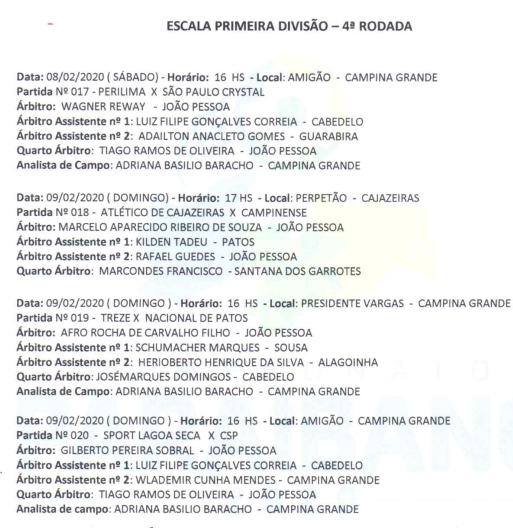Os árbitros e assistentes da quarta rodada do Campeonato Paraibano de 2020 estão definidos. Marcelo Aparecido comanda Atlético de Cajazeiras e Campinense, no Perpetão. Enquanto que, Afro Rocha apita Treze e Nacional de Patos, no estádio Presidente Vargas.