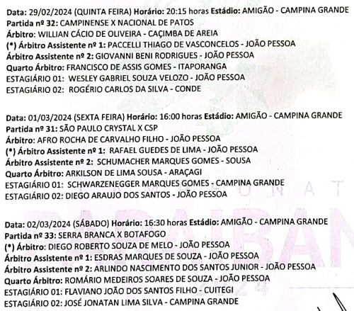 Com jogos na quinta-feira (29), sexta-feira (1), no sábado (2) e no domingo, estão definidos os árbitros da sétima rodada do Campeonato Paraibano. Quatro partidas serão disputadas no estádio Amigão, em Campina Grande.