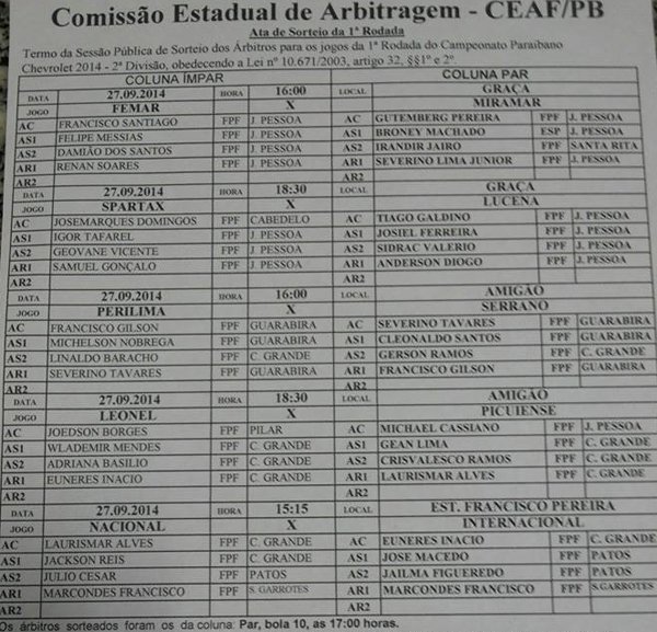 Definidos os árbitros para a primeira rodada do Campeonato Paraibano da Segunda Divisão de 2014, com jogos no sábado. Serão dois jogos no estádio da Graça, em João Pessoa. Mais dois em Campina Grande, no Amigão e outro na cidade de Pombal, no estádio Francisco Pereira. De acordo com o presidente do Sindicato dos Árbitros da Paraíba, Genildo Januário, a coluna par foi a sorteada.