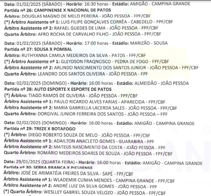 Estão definidos os árbitros para a sexta rodada do Campeonato Paraibano da Primeira Divisão de 2025, com dois jogos no sábado (1), outros dois no domingo (2) e uma partida na segunda-feira (3).
