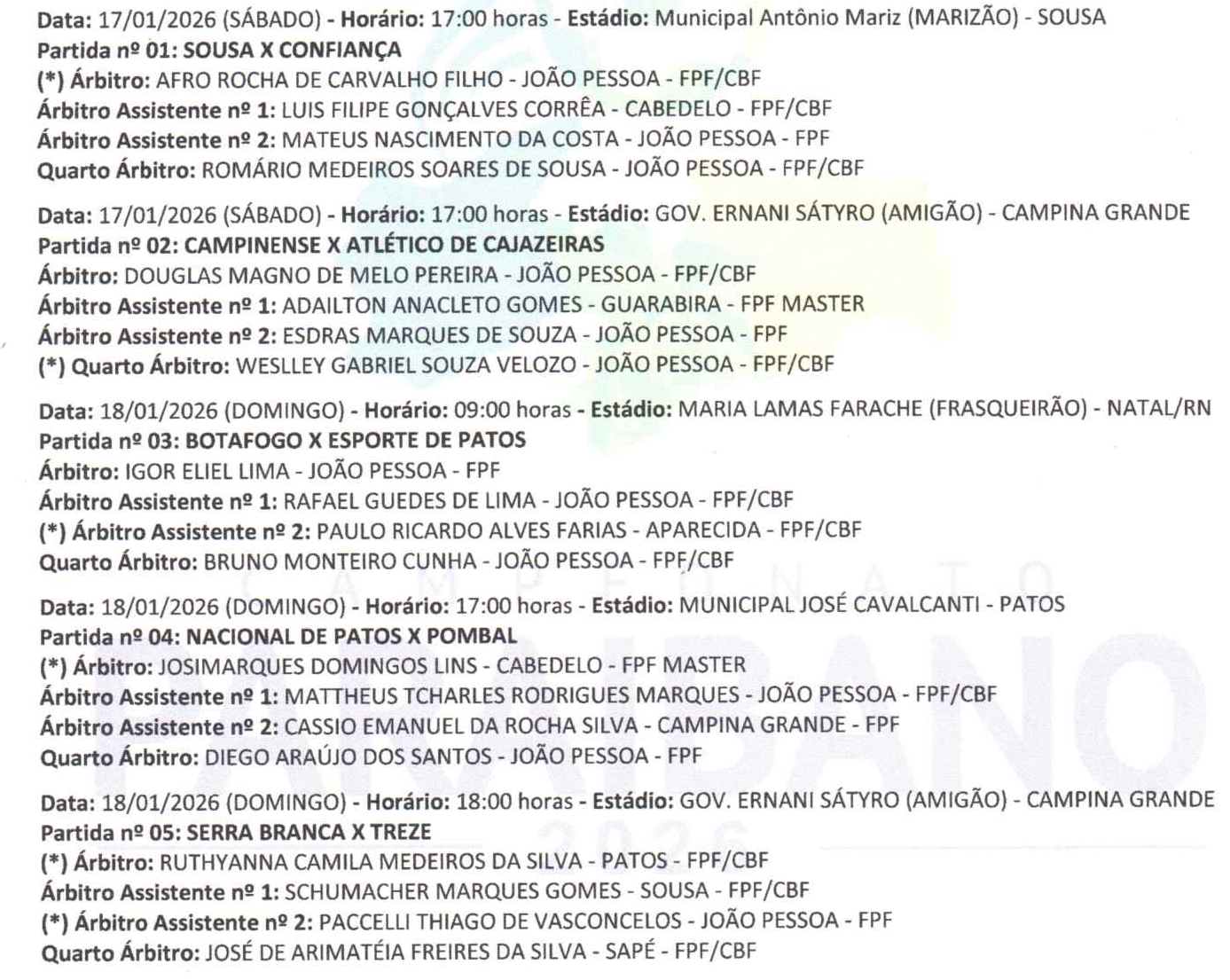 Estão definidos os árbitros para os cinco jogos da primeira rodada do Campeonato Paraibano da Primeira Divisão de 2026. Tem jogos no sábado, domingo e segunda-feira, conforme a tabela da arbitragem: Sousa x Confiança-PB: Afro Rocha de Carvalho Filho; Campinense x Atlético de Cajazeiras: Douglas Magno de Melo Pereira; Botafogo-PB x Esporte de Patos: Igor Eliel Lima; Nacional de Patos x Pombal: Josimarques Domingos Lins; e Serra Branca x Treze: Ruthyanna Camila