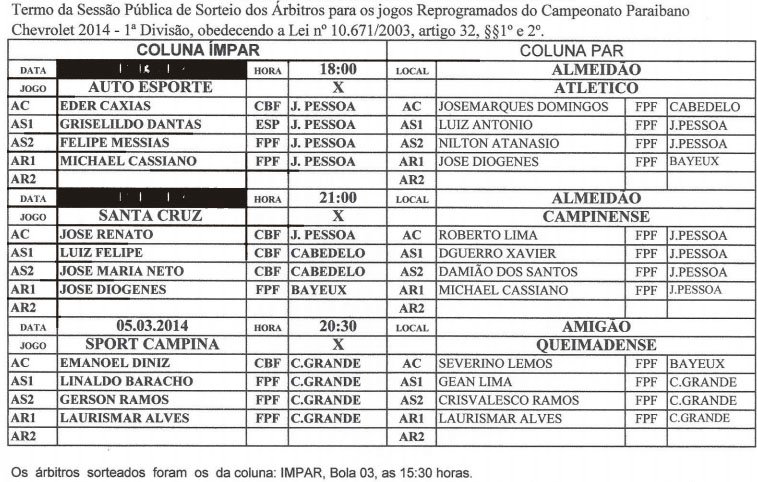 Definidos três jogos atrasados, valendo pela 11a rodada do Campeonato Paraibano de 2014, primeiro turno. As partidas serão disputadas na quarta-feira de cinzas e quinta-feira acordo com a escala de árbitros divulgada pela Federação Paraibana de Futebol.