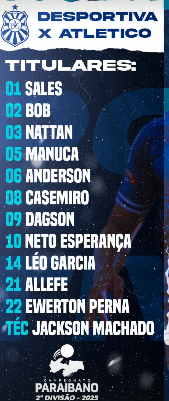 Desportiva Guarabira 2×2 Atlético de Cajazeiras, nesta segunda-feira (29). O encontro, no estádio Sílvio Porto, às 20h, tem validade pela fase semifinal do Campeonato Paraibano da Segunda Divisão.