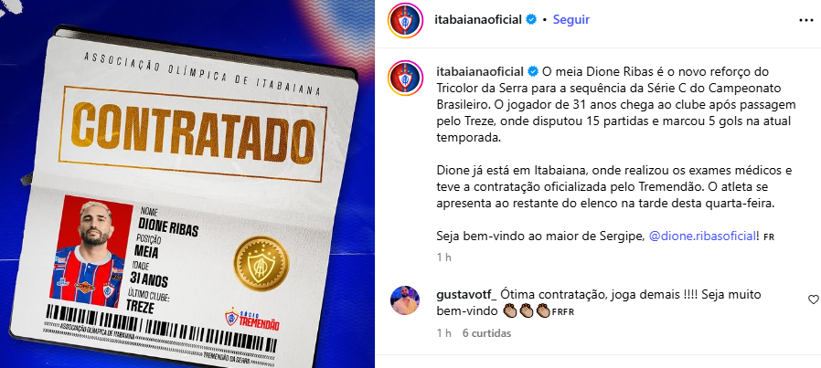 A contratação do atleta foi divulgada pelo próprio Itabaiana em publicação no seu instagram.