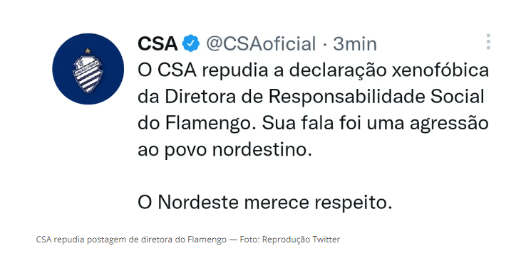 O CSA, segundo o ge-AL se manifestou na madrugada desta quarta em suas redes sociais sobre uma postagem da diretora de responsabilidade social do Flamengo, Angela Machado, em relação aos nordestinos. O clube de Alagoas considerou o post preconceituoso.