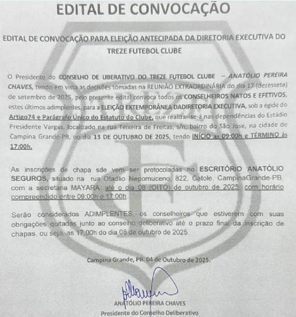 As eleições para escolha da nova diretoria do Treze Futebol Clube será no próximo dia 13. A informação foi passada para o soesporte pelo presidente do Conselho Deliberativo do clube, Anatólio Chaves. Com isso, o prazo para inscrições de chapa vão até o dia 8.