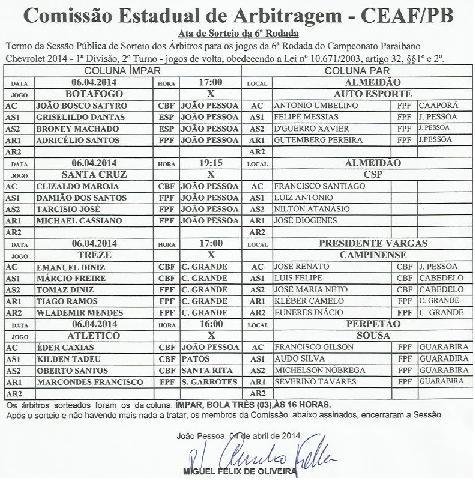 A Federação Paraibana de Futebol (FPF) divugou no final da tarde desta quinta-feira (03) a escala de arbitragem para a sexta rodada do returno, que tem três jogos no domingo e um na segunda-feira.