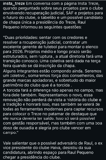 O propenso candidato a presidente do Treze, o empresário Raul Pequeno, aponta suas prioridades que serão aplicadas na sua administração: “sentar com credores e resolver a recuperação judicial, contratar um excelente gerente de futebol para montar o elenco para 2026.” As declarações foram publicadas pelo insta_treze, um grupo do instagram especializado em notícias do Treze.