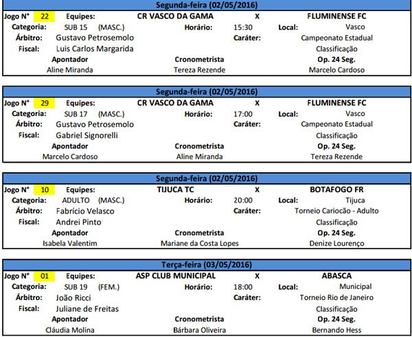 A rodada do Campeonato Carioca de basquetebol desta segunda-feira programa jogos pelo Sub 15, Sub 17, jogos que serão disputados no ginásio principal do Vasco da Gama, de acordo com a escala de árbitros, que ainda tem jogo no ginásio da Tijuca, pela categoria Sub Adulta, todos no masculino. Na terça-feira tem um jogo isolado pelo feminino, no Municipal.