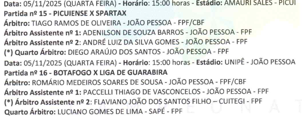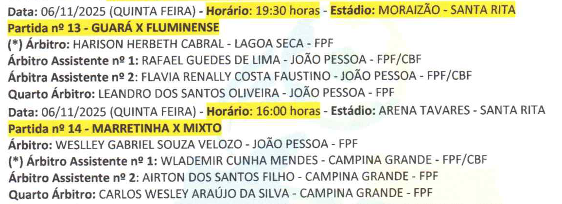 Veja a escala de arbitragem para os jogos deste meio de semana do Paraibano de Futebol Feminino Adulto de 2025. Duas partidas serão disputadas nesta quarta-feira (5) e outras duas na quinta-feira (6).