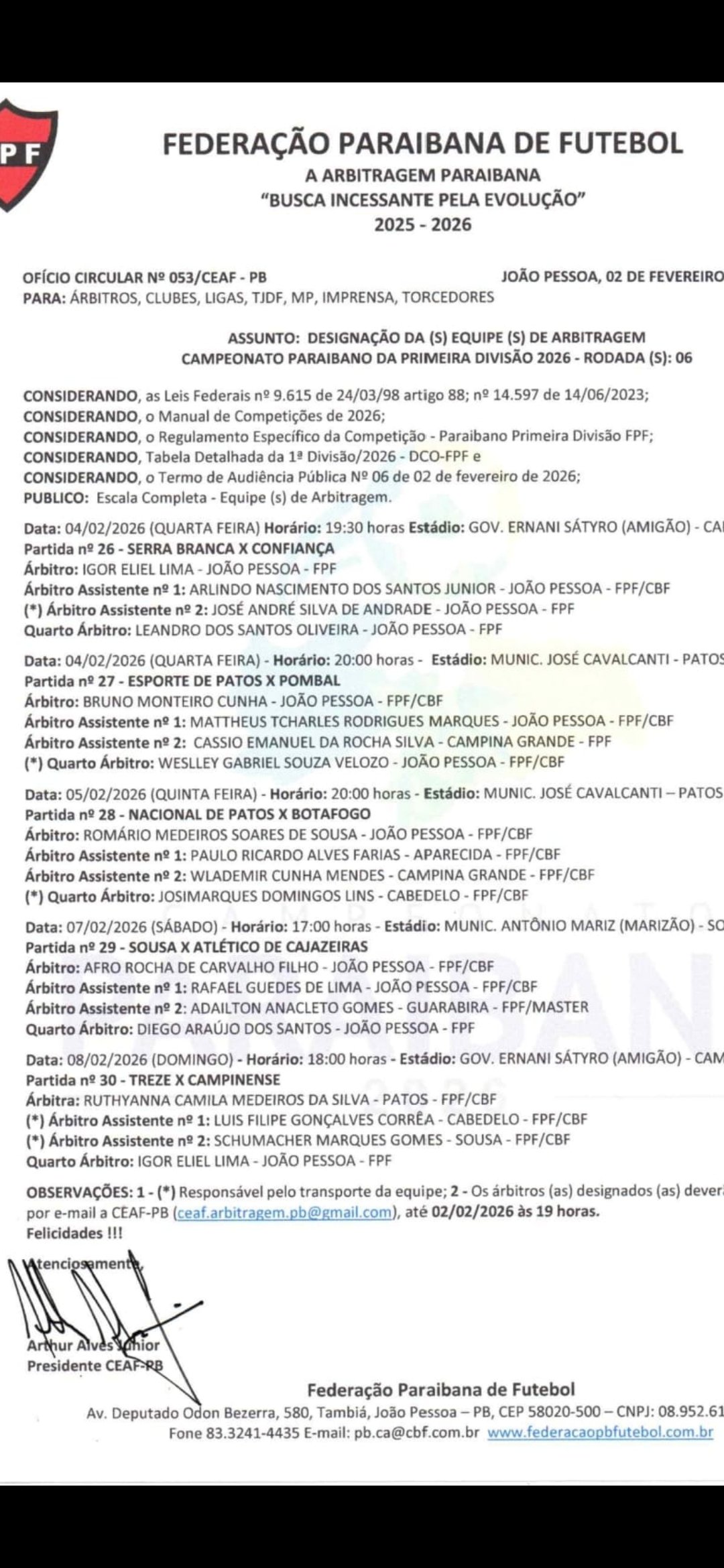 A sexta rodada do Campeonato Paraibano da Primeira Divisão tem jogos na quarta-feira, quinta-feira, sábado e domingo, conforme escala de árbitros.