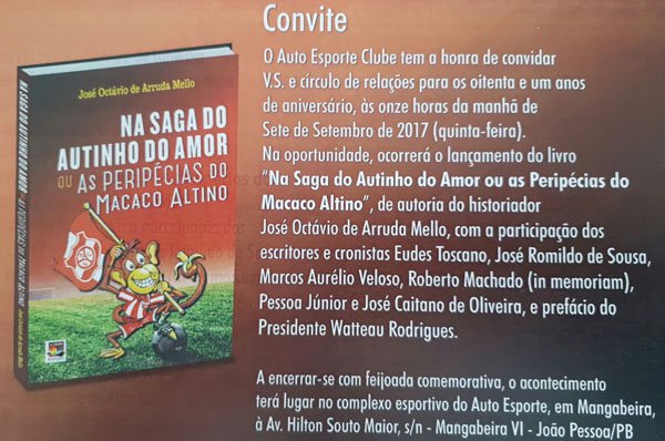Com parte do aniversário do Auto Esporte Clube, comemorado nesta quinta-feira, dia 7 de setembro, o escritor José Octávio de Arruda Melo lança o livro sobre história do Auto Esporte. O título do livro NA SAGA DO AUTINHO DO AMOR ou AS PERIPÉCIAS DO MACACO ALTINO.