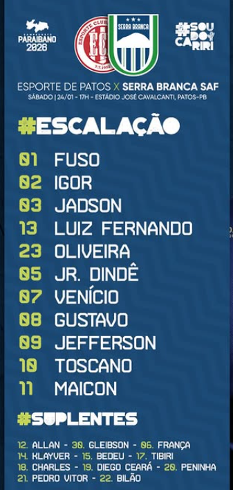 Esporte de Patos 0x2 Serra Branca, gols de Marcelo Toscano e Gustavo. Com este resultado, o Serra se coloca em situação estável em busca das primeiras colocações.