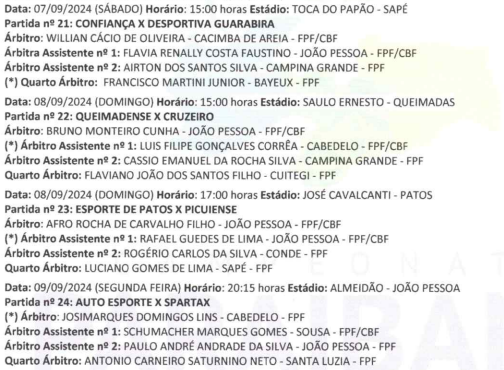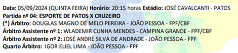 A Federação Paraibana de Futebol, através da comissão de arbitragem, confirmou os árbitros para o jogo entre Esporte de Patos e Cruzeiro de Itaporanga. Além disso, divulgou o pessoal que vai trabalhar na arbitragem dos quatros jogos da quinta rodada da competição estadual, no próximo fim de semana.