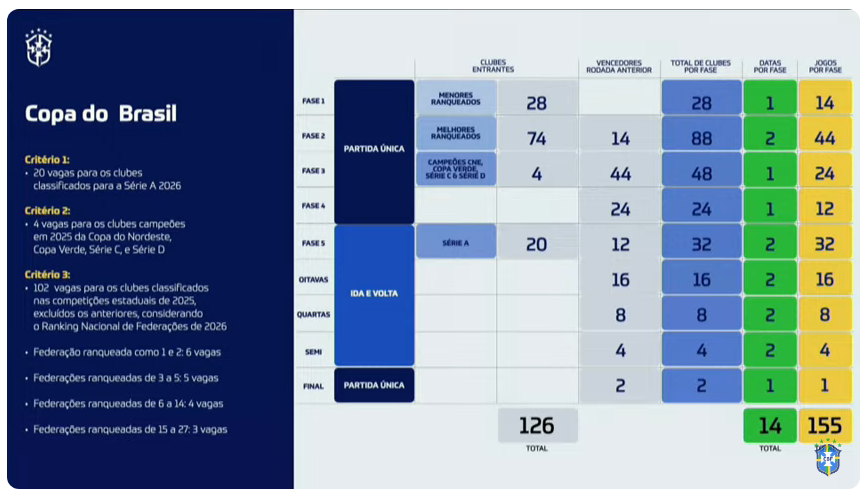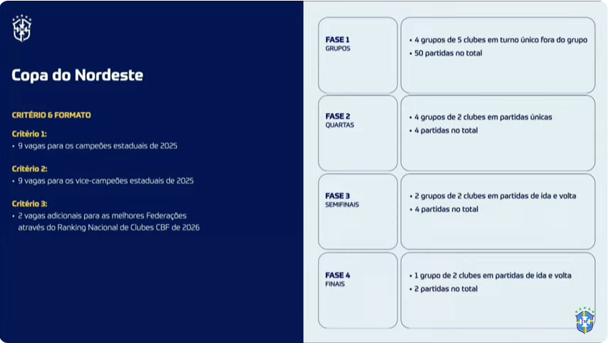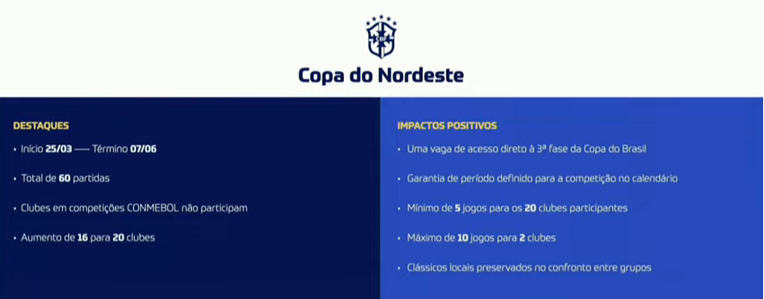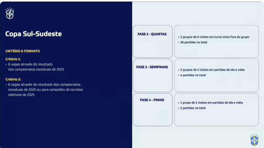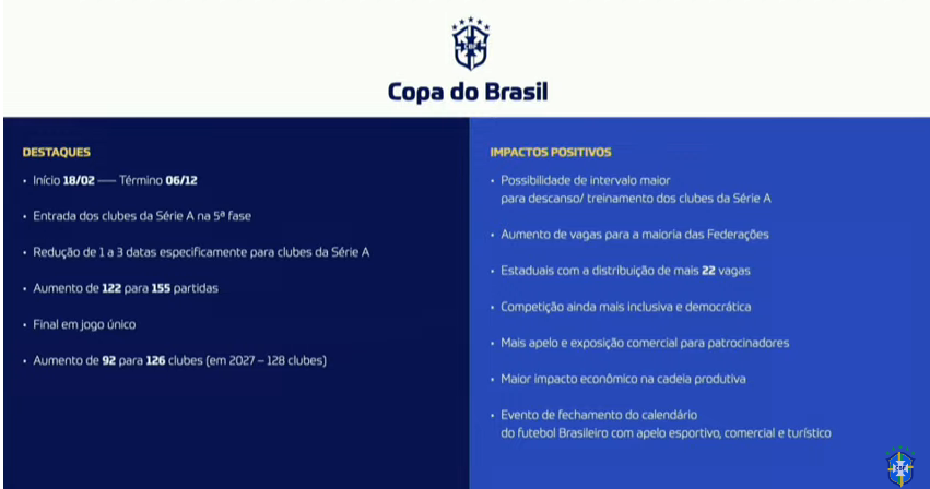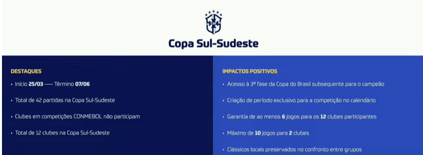 Além das novas datas, foi anunciada também uma nova competição: a Copa Sul-Sudeste, que será disputada simultaneamente à Copa Verde e a Copa do Nordeste. Na Copa do Brasil, todos os clubes da Série A entrarão na ‘5ª fase do torneio’, haverá aumento de 92 para 126 clubes (128 a partir de 2027) e final em jogo único.