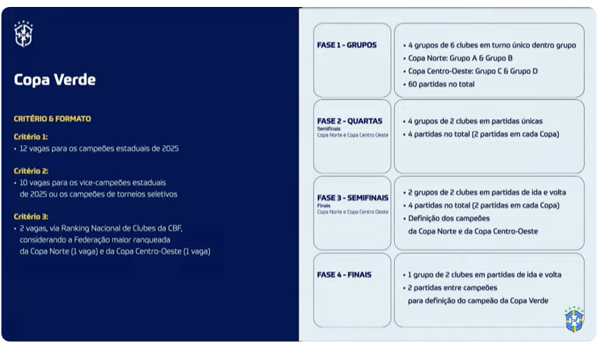 Já a Copa Verde irá manter o número de participantes e abrangerá o retorno da Copa Norte e a criação da Copa Centro-Oeste. Times do Espírito Santo também jogarão o torneio.