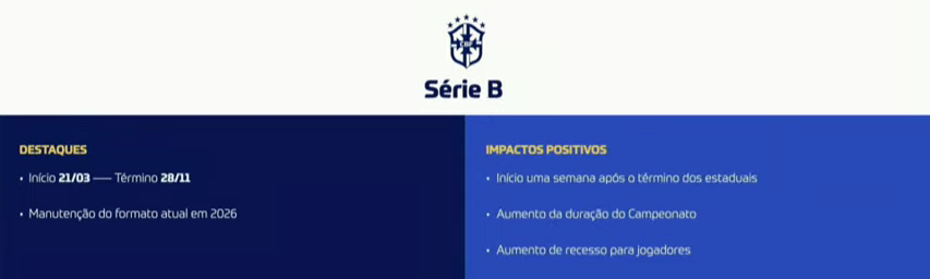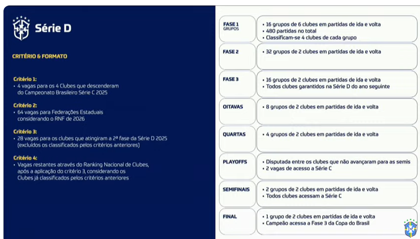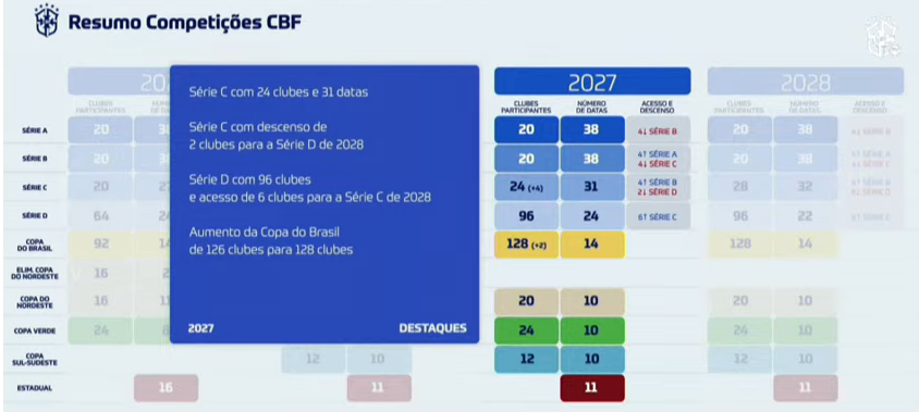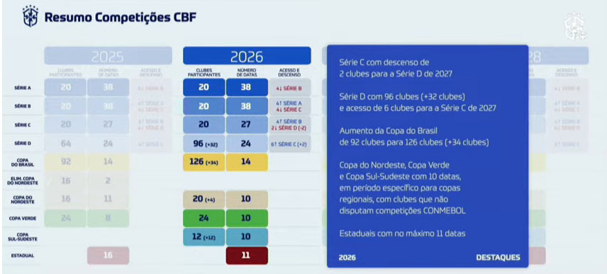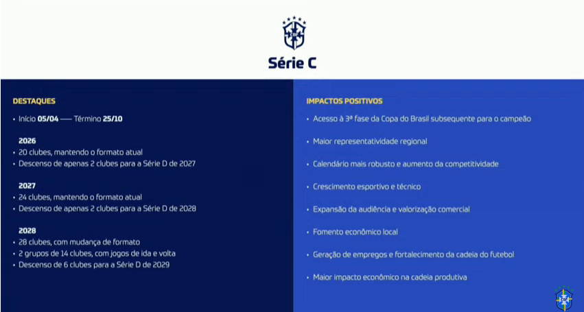 A Série C, por outro lado, passou por mais mudanças. A partir do próximo ano, apenas dois clubes serão rebaixados para a Série D, na qual seis equipes serão promovidas para a ‘terceirona’. Em 2027, o cenário se repete para que então, em 2028, a competição chegue a 28 clubes (2 grupos de 14, com jogos de ida e volta), rebaixando seis times para a Série D 2029.