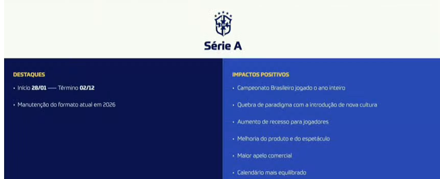 Entre as mudanças do calendário da CBF estão as novas datas para inícios das competições. Estaduais começam no dia 11 de janeiro. Copa do Brasil com final única, Brasileirão em janeiro, estaduais reduzidos e novo torneio; como será novo calendário do futebol brasileiro.