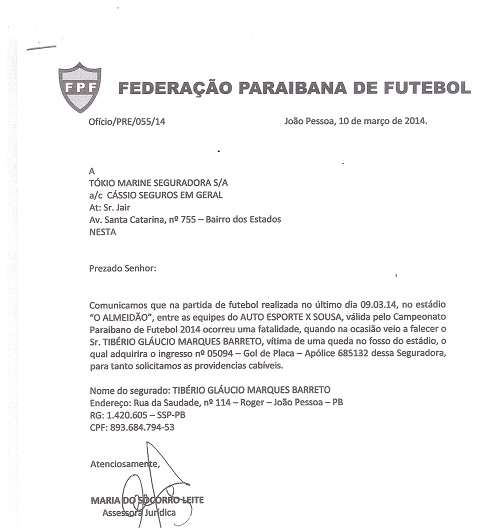 O departamento jurídico da Federação Paraibana de Futebol encaminhou informações a Tókio Marine Seguradora sobre a morte do torcedor do Auto Esporte, Tibério Barreto, ocorrido no último domingo entre Auto Esporte 1×1 Sousa, pelo Campeonato Paraibano de 2014.