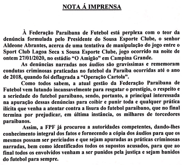 A presidente da Federação Paraibana de Futebol, Michelle Ramalho divulgou nota, nesta terça-feira, se dizendo perplexa com o teor da denúncia formulada pelo presidente do Sousa, Aldeone Abrantes, acerca de uma tentativa de manipulação do jogo entre Sport Lagoa Seca e Sousa. Veja a nota: