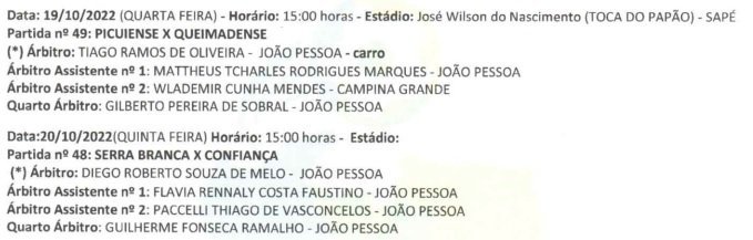 A escala de árbitros para os dois jogos do Campeonato Paraibano da Segunda Divisão foi divulgada nesta segunda-feira (17) . O jogo Picuiense x Queimadense será na quarta-feira (19), às 15h, na Toca do Papão em Sapé. O detalhe é que, um encontro entre Serra Branca x Confiança de Sapé não foi definido o local.