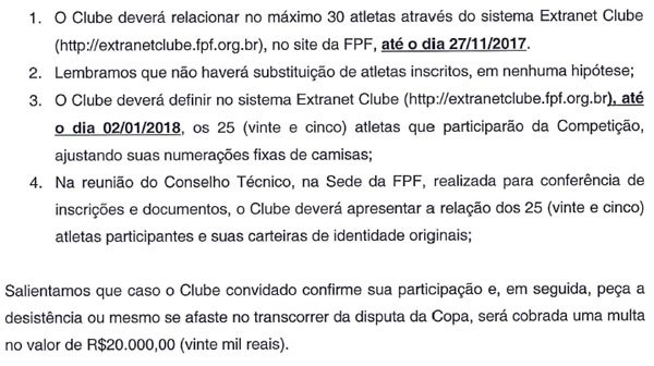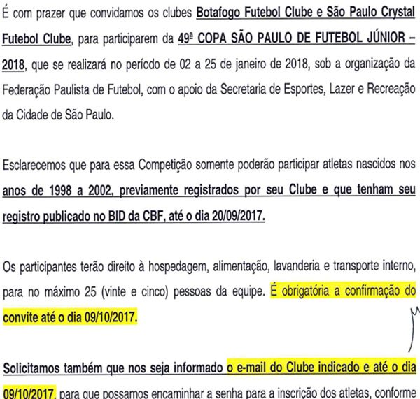 A Federação Paulista de Futebol confirmou oficialmente a participação de Botafogo da Paraíba e São Paulo Crystal nas disputas da Copa São Paulo de de Futebol Juniores de 2018. O ofício foi encaminhado nesta quarta-feira à Federação Paraibana de Futebol.