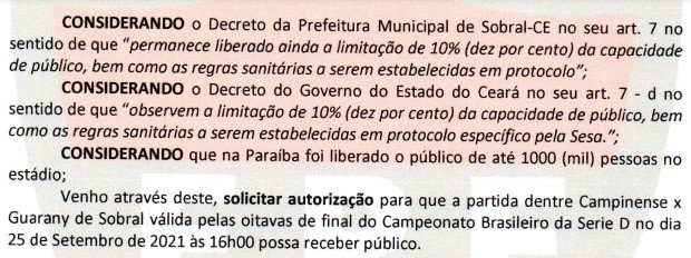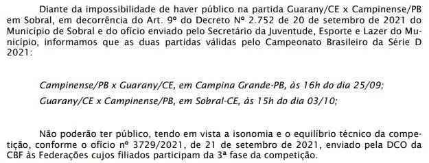 A documentação encaminhada pela presidente da Federação Paraibana de Futebol, Michele Ramalho à CBF estava baseada. É que, o Governo da Paraíba autorizou a volta de torcedores vacinados aos estádios.