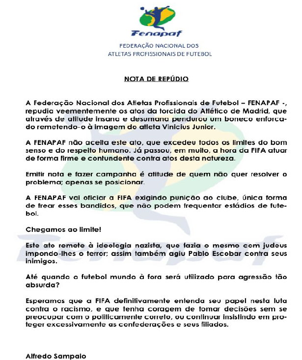 A Federação Nacional dos Atletas Profissionais de Futebol (Fenapaf) divulga nota de repúdio veementemente devidos os attos da torcida do Atlético de Madrid, que através de atitude insana e desumana pendurando um boneco enforcado remetendo-o a imagem do atleta Vinícius Junior.