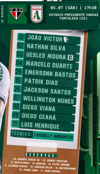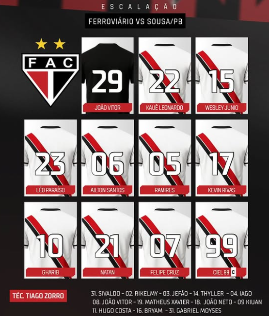 O Ferreviário-CE, técnico Tiago Zorro definiu a escalação coral para o duelo diante do Sousa-PB pela décima primeira rodada do Campeonato Brasileiro.