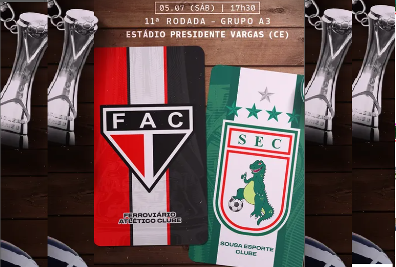 Ferroviário-CE 0x0 Sousa, neste sábado (5), pela 11a da Série D do Campeonato Brasileiro, às 17h30, no estádio Presidente Vargas, em Fortaleza-CE.