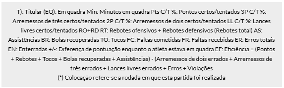 Pelo lado do Vasco da Gama, Pedro Nunes foi o principal nome da equipe, com 20 pontos, nove assistências e cinco rebotes para 29 de eficiência. Além dele, Gustavo Basilio também teve bom desempenho, fechando o jogo com 16 pontos, seis rebotes e cinco assistências para 15 de eficiência.