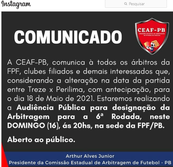 A Comissão Estadual de Arbitragem de Futebol da Paraíba antecipa escala dos árbitros. Por isso, os contemplados da sexta rodada do Campeonato Paraibano de 2021 conhecidos neste domingo. De acordo com o diretor da CEAF-PB, Arthur Alves Junior, a antecipação é devido jogo do Treze e Perilima. Com isso, o encontro será nesta terça-feira, no estádio Amigão, em Campina Grande.