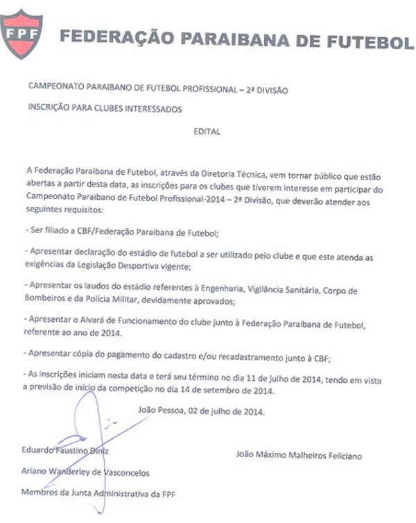 A Federação Paraibana de Futebol convoca clubes para a Segunda Divisão de 2014 que irá credenciar dois clubes para a Primeira Divisão de 2015.