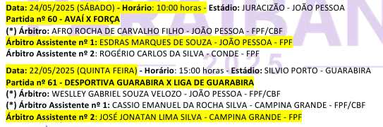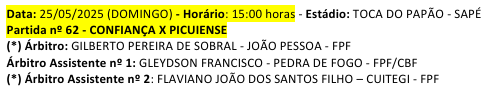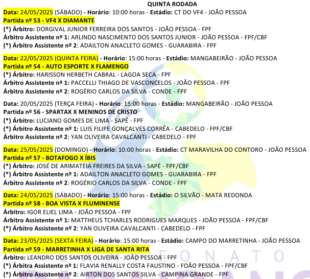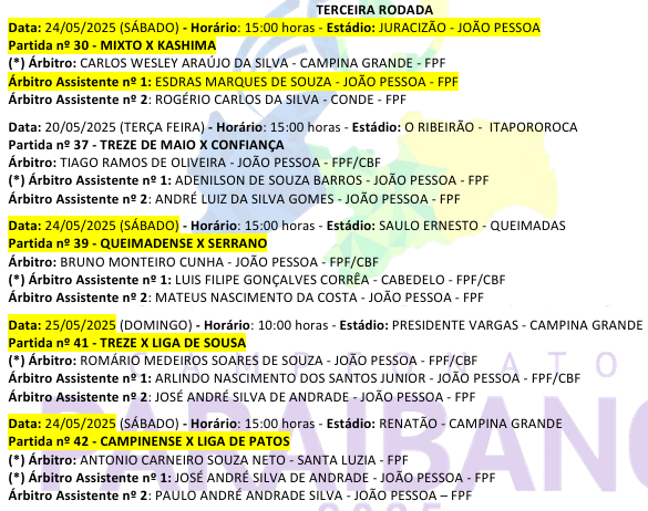 O Confiança de Sapé venceu o Treze de Maio por 3 a 2, nesta terça-feira (20), pela terceira rodada do Campeonato Paraibano de Futebol Masculino Sub-17, no estádio Riveirão, em Itapororoca-PB. Na outra partida da competição, o Spartax e Meninos de Cristo empataram em 1 a 1, no estádio Mangabeirão, em João Pessoa-PB. Veja a arbitragem de todas as partidas programadas para esta semana no Sub-17.