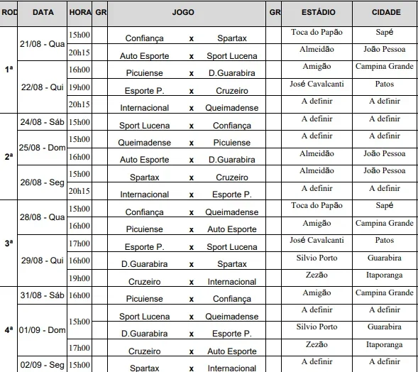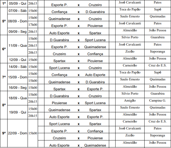 A Federação Paraibana de Futebol, através da diretoria de competições, divulgou o restante da tabela do Campeonato Paraibano da Segunda Divisão de 2024. São as cinco últimas rodadas da primeira fase. Além disso, a FPF também confirmou para o próximo dia 5, o jogo entre Esporte de Patos x Cruzeiro de Itaporanga, pela primeira rodada da competição. Veja a tabela completa: