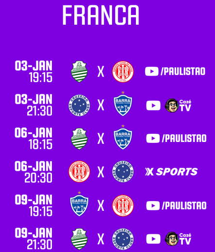 O primeiro jogo da competição será entre Meia Noite e Real-RR, às 8h45, pelo Grupo 14, com sede em Patrocínio Paulista. Pela mesma chave, Ponte Preta e Coritiba-PR duelam às 11h.