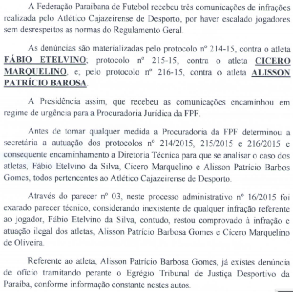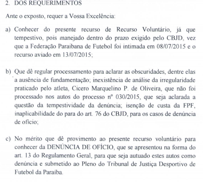 A Federação Paraibana de Futebol – FPF, inconformada com o arquivamento do processo nº 033/2015, pelos procuradores da Justiça Desportiva, Tiago Sobral Pereira Filho e José Tertuliano Silva Guedes Junior e ratificado pelo Presidente da Corte Desportiva Dr. Lionaldo Santos Silva, entra com Recurso Voluntário para modificação do decidium monocrático do referido Presidente.