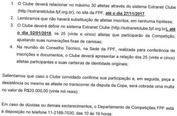 A Federação Paulista de Futebol divulgou comunicado determinando que os clubes que irão disputar a Copa São Paulo de Juniores de 2018, terão que entregar uma lista com 30 atletas, até o próximo dia 11 de novembro. A Paraíba será representada por Botafogo e São Paulo.