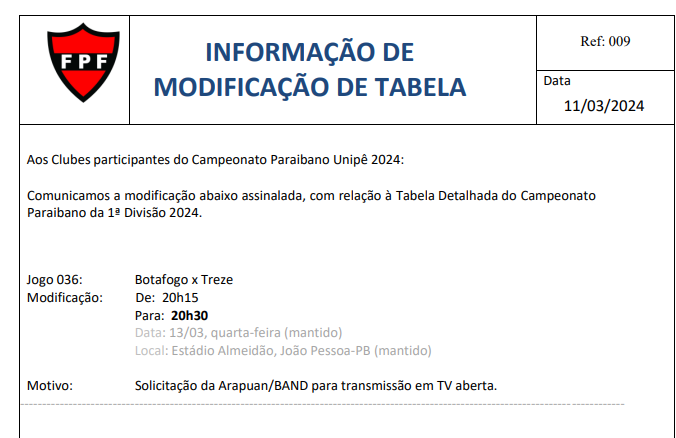 A Federação Paraibana de Futebol (FPF) fez uma pequena alteração no horário da partida entre Botafogo-PB e Treze, quarta-feira (13), no Estádio Almeidão. O jogo, que seria disputado às 20h15, agora será iniciado às 20h30.